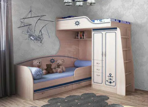 Фасады мебели стилизованы под морскую тематику. Декорированы прямой уф-фотопечатью в голубом цвете. Производится мебель из австрийского ЛДСП концерна Эггер (1,6 см и класс Е1) с использованием кромки ПВХ и металлических креплений. Европейская фурнитура.