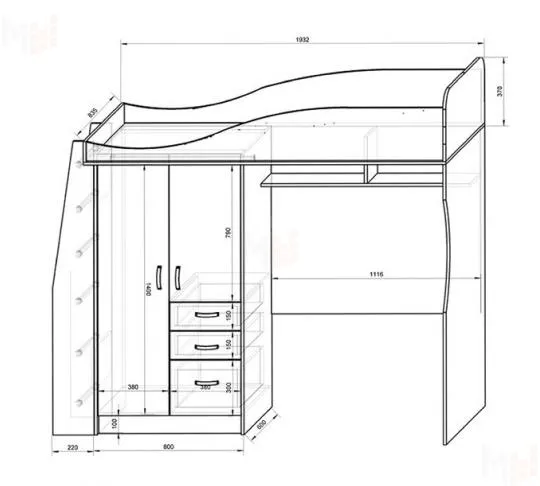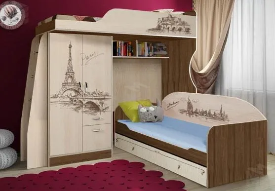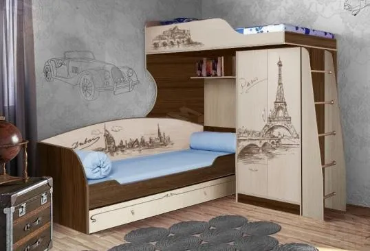 Каждый модуль отличается удобством и функциональностью для детей и подростков. В конструкции чердака предусмотрены шкаф двухдверный, полка и лестница; в нижней кровати - выдвижной ящик и ортопедическая решетка.