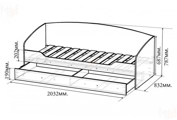 Кровать ФТР-01: 2032х787х832 мм. Спальное место 2000х800 мм. -
