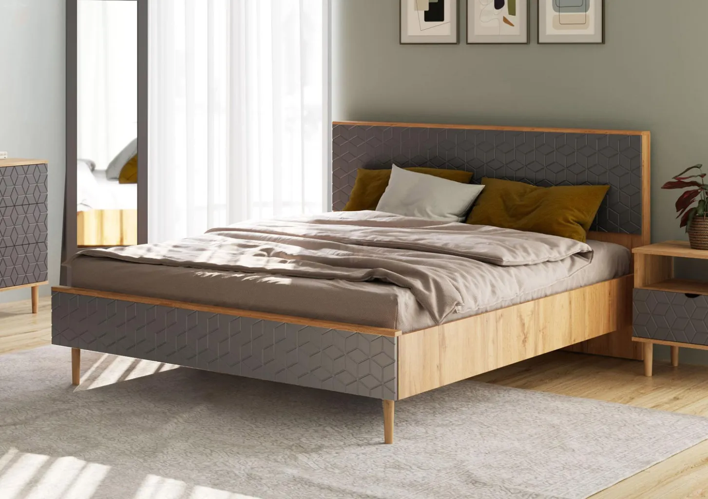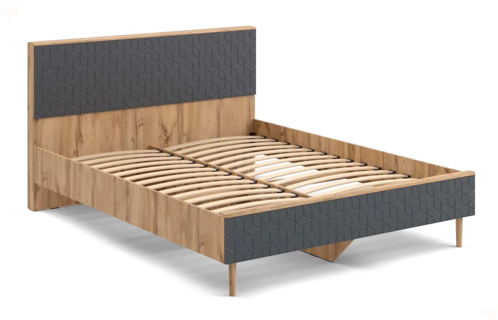 Кровать украшена фрезеровкой, представлена в шикарном цветовом сочетании “Дуб вотан/Графит”, которое привнесет в Ваш дом ощущение стиля, тепла и спокойствия. Опоры-ножки из массива березы, покрытые лаком придают конструкции визуальную легкость. -