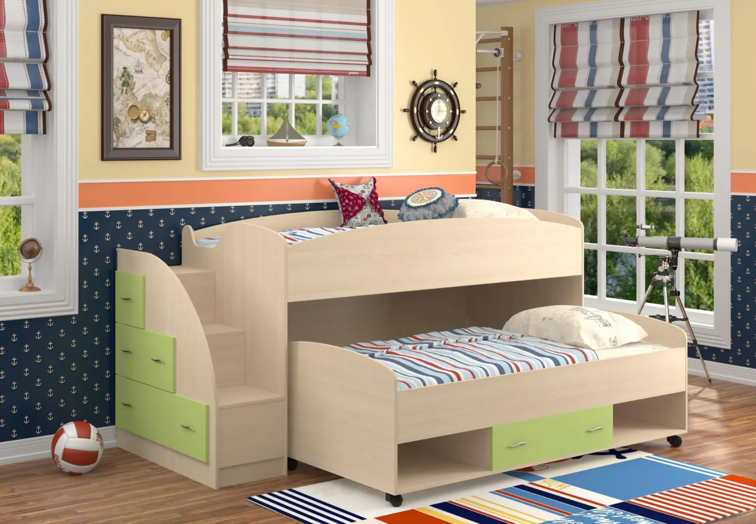 Детская двухъярусная кровать Дюймовочка-4/3 — два полноценных спальных места и лестница с боковыми выдвижными ящиками. Нижняя выкатная кровать оборудована нишами и выдвижным ящиком. Прочная конструкция рассчитана на детей от 1 до 18 лет. Такая детская обеспечит разумную экономию пространства в вашем доме. Дополнением к данной кровати могут быть любые композиционные решения из серии Дельта.