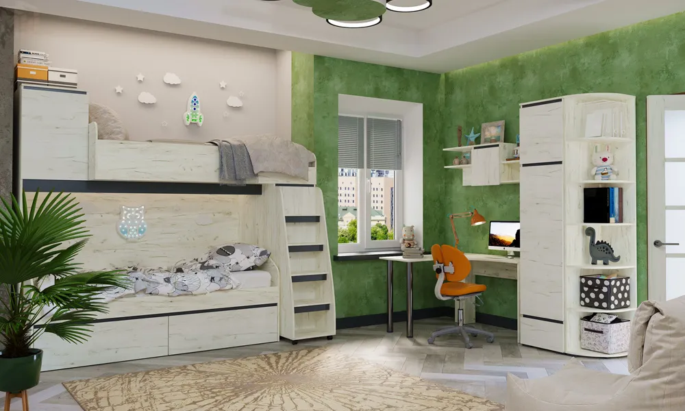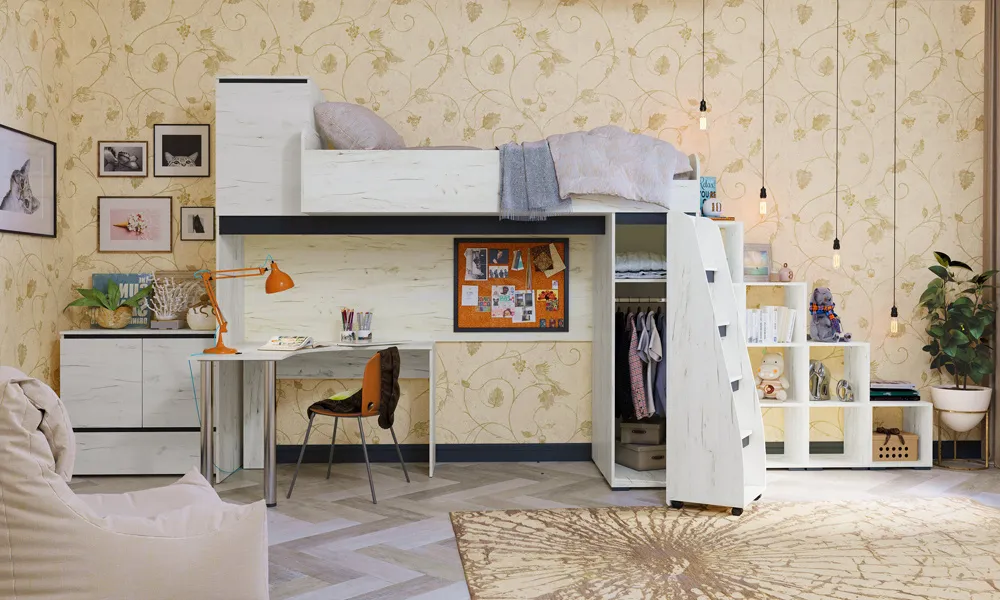 Кровать двухъярусная "ГРЕТТА" с антресолью и встроенным шкафом с металлической штангой для одежды. Кровать отлично сочетается с другими элементами коллекции «ГРЕТТА», и будет прекрасным решением для грамотной организации пространства спальни для детей и подростков, учитывая габариты спального места: 2000 х 900 мм. Применение интегрированной ручки на фасадах делает модель стильной и безопасной. Фасад и боковины кровати обработаны кромкой 1 мм.