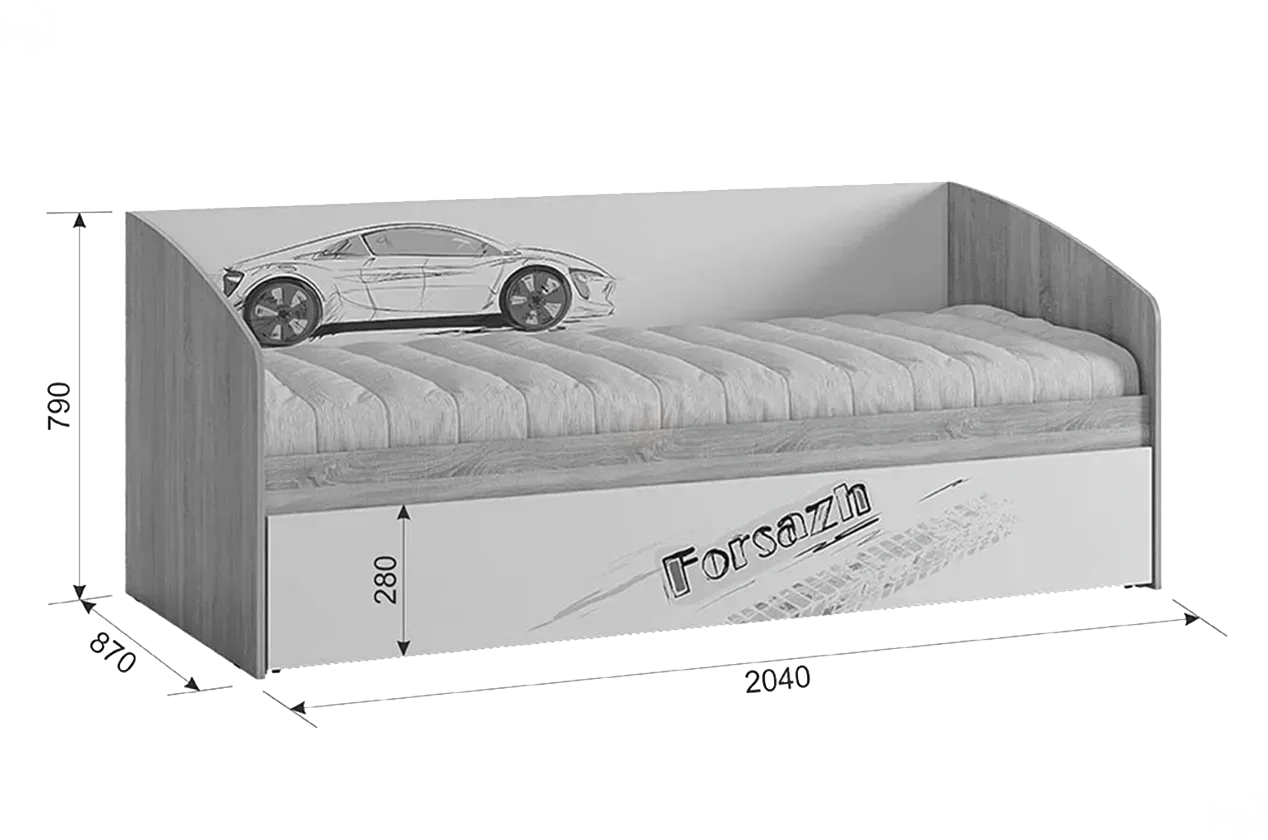 Дополнительное удобное спальное место или большой выдвижной ящик для хранения постельного белья и игрушек, на выбор, решать вам. Стильный принтерный рисунок на фасаде. Детская «Форсаж» - это стильная, современная детская, которая понравится каждому ребенку. Рисунок устойчив к истиранию и ультрафиолету.
