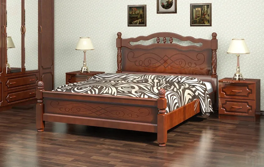 Кровать Карина-15 выполнена из массива сосны, спинка с элементами МДФ. Кровать декорирована в цвет орех. Кровать может быть дополнена прикроватными тумбами, комодом, шкафами в едином стиле. Спальное место 160*200 см. Ортопедическое основание под матрас входит в стоимость.