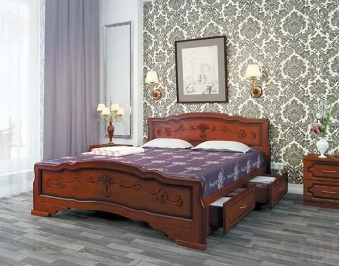 Кровать "Карина-6" выполнена из массива сосны и окрашена в цвет орех.