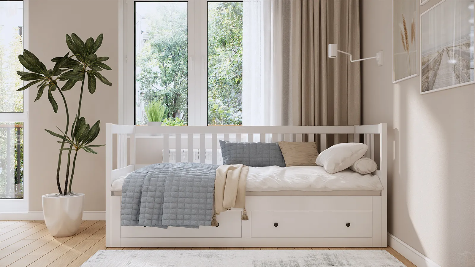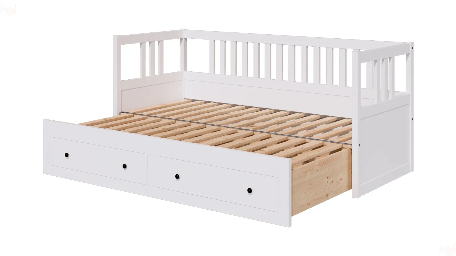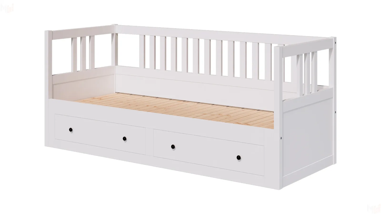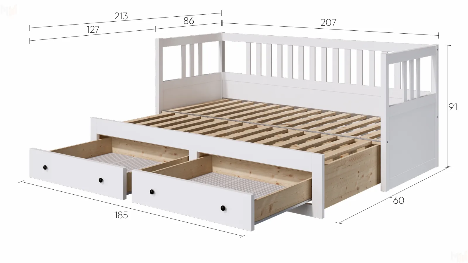 Кровать оснащена двумя выдвижными ящиками, которые можно использовать для хранения постельного белья, игрушек или других вещей. Максимальная нагрузка на спальное место составляет 140 кг, что делает ее подходящей для людей разного телосложения.