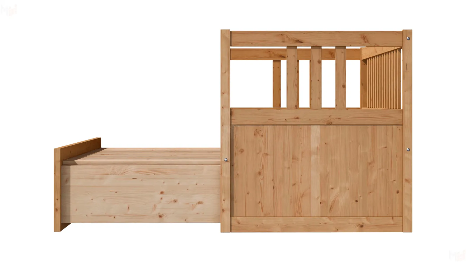 Кровать выполнена в классическом натуральном цвете, который легко впишется в любой интерьер. Каркас кровати изготовлен из массива сосны, что гарантирует прочность и долговечность изделия.