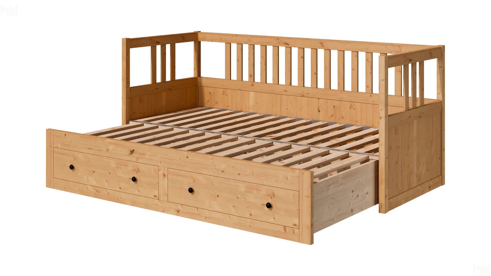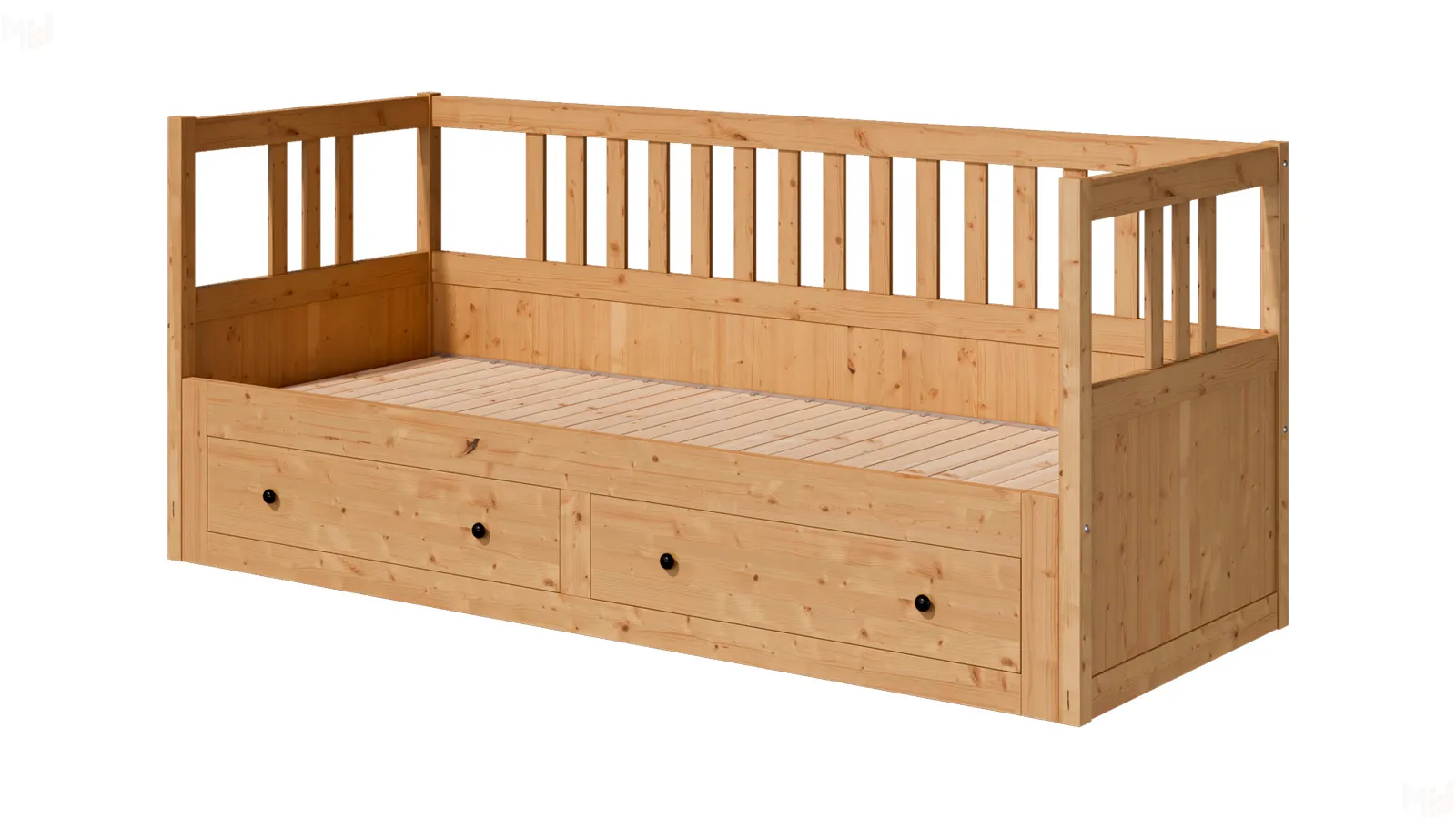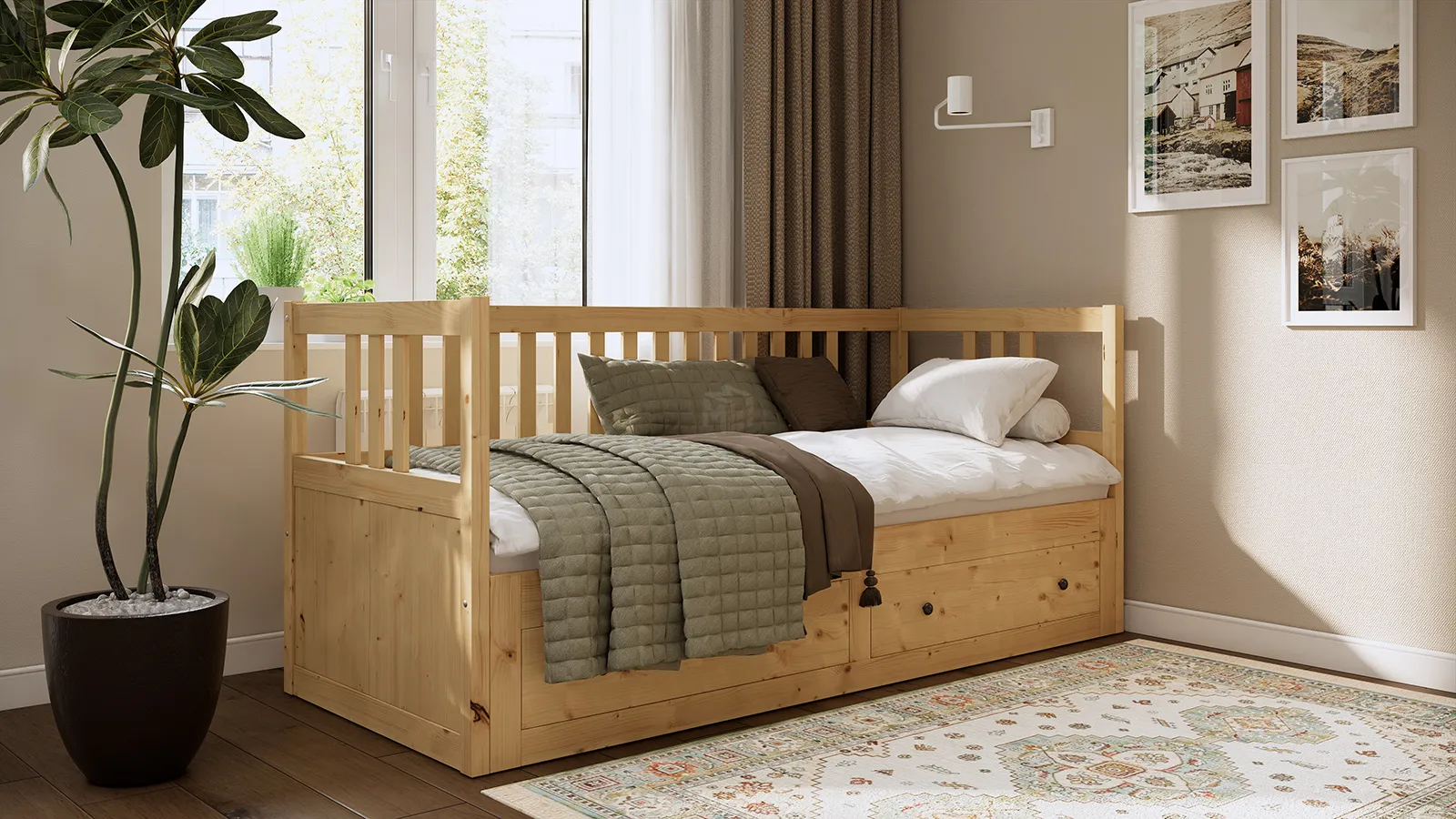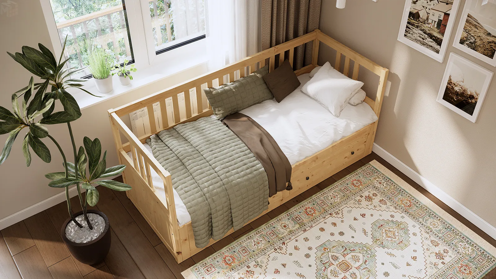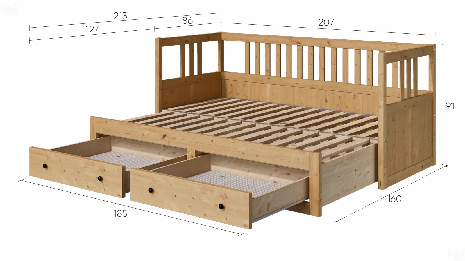 Кровать оснащена двумя выдвижными ящиками, которые можно использовать для хранения постельного белья, игрушек или других вещей. Максимальная нагрузка на спальное место составляет 140 кг, что делает ее подходящей для людей разного телосложения.