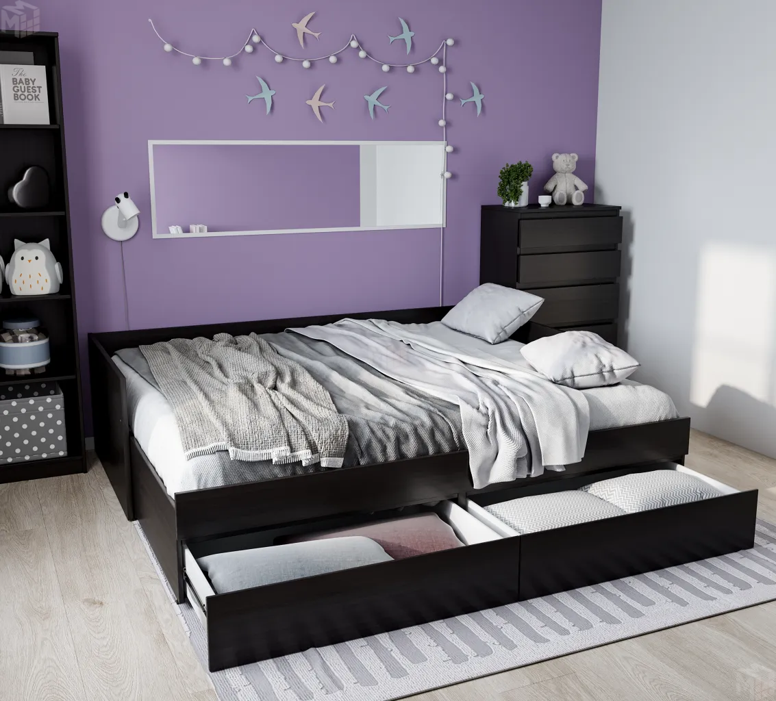 Днем на кушетке удобно сидеть, а ночью она легко превратится в односпальную или двуспальную кровать. В двух вместительных ящиках можно хранить одеяла, подушки и постельное белье. Отличное решение, особенно, если в комнате немного места.