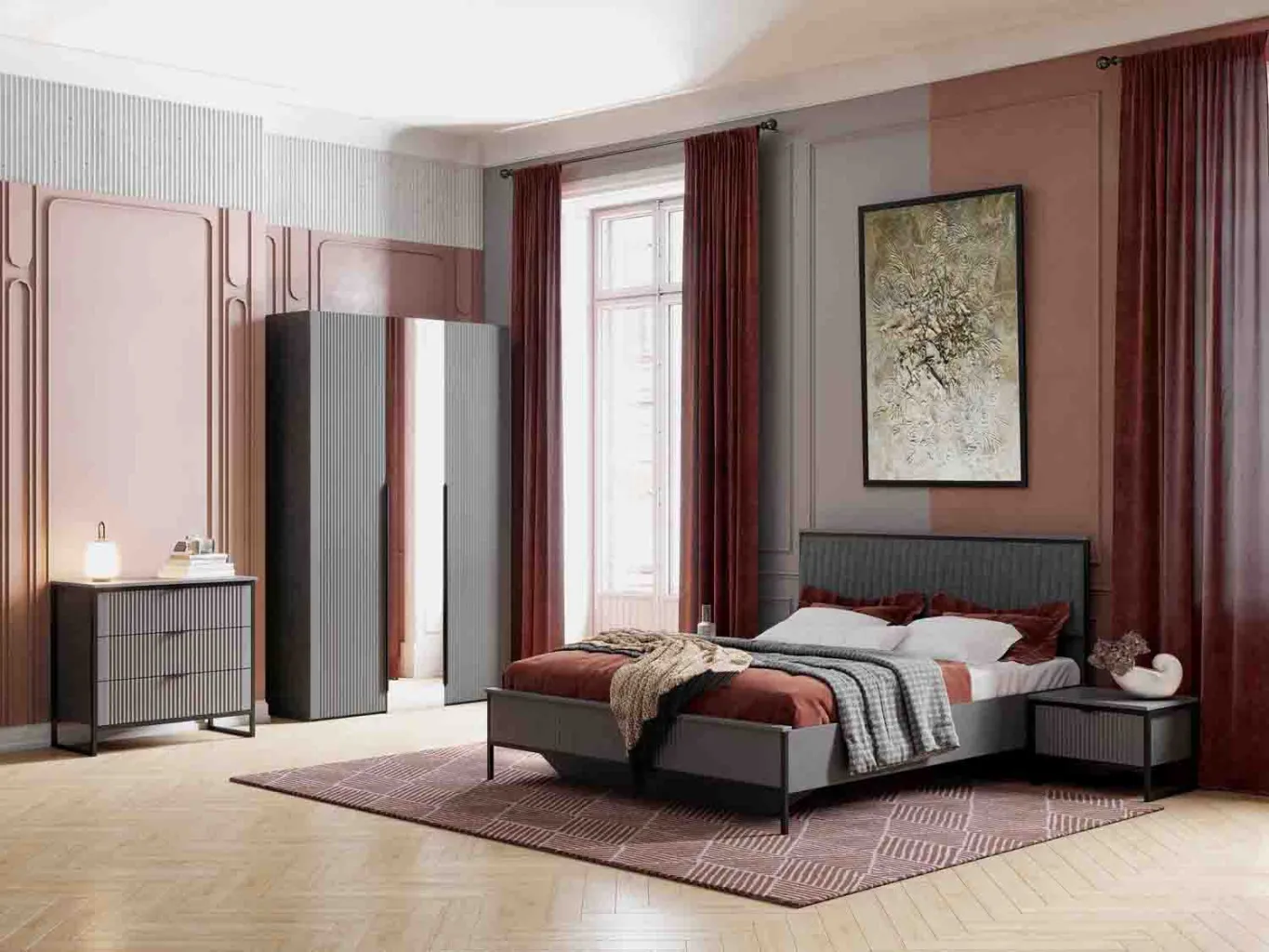 Коллекцию модульной спальни "Нора" отличает современный оригинальный стиль. Декоративная продольная фрезеровка на МДФ фасадах цвета Графит и опоры на металлокаркасе цвета черная эмаль соответствуют модным тенденциям этого года в ведущих зарубежных коллекциях.