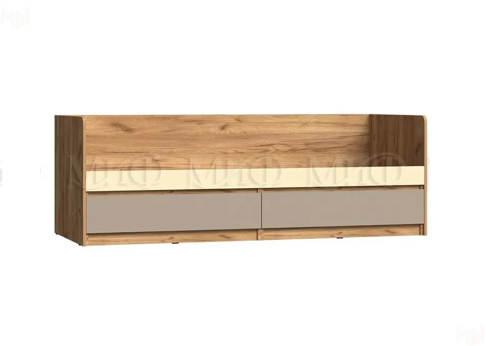 Корпус кровати выполнен из ЛДСП Крафт золотой, фасады ЛДСП Глиняный серый/слоновая кость. -