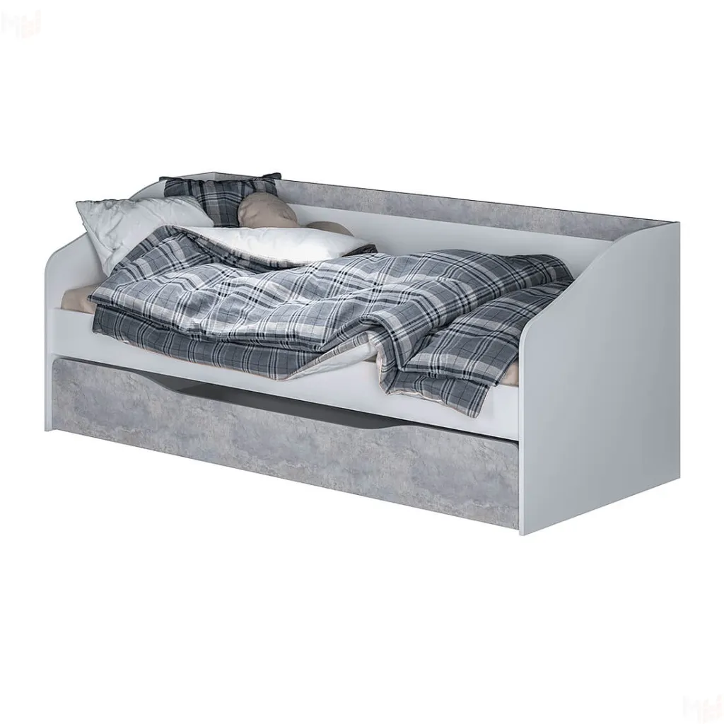 Кровать с закругленными углами и с выкатным ящиком на роликовой опоре, который можно использовать как дополнительное спальное место, так и как место для хранения вещей.