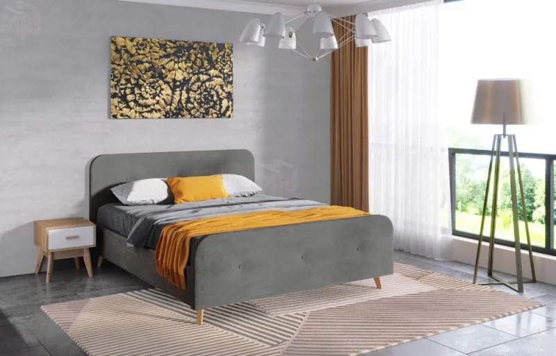 Изголовье имеет закругленный силуэт, обтянут велюровой тканью с пуговицами, что обеспечивает дополнительную мягкость и уют. Высокие стильные ножки из массива березы создадут ощущение легкости и воздушности.