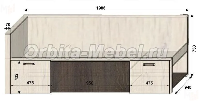 Кроватка имеет в изголовье ящик с распашной дверцей, средний ящик выдвижной, в изножье декоративная фальш-панель и полая ниша.