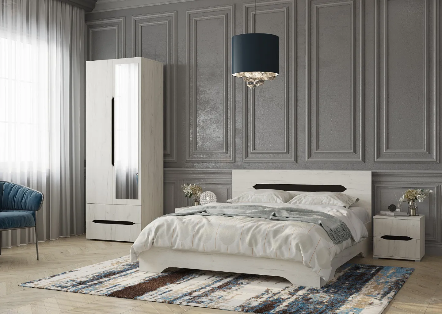 Кровать можно дополнить прикроватной тумбой, комодом, шкафом.
