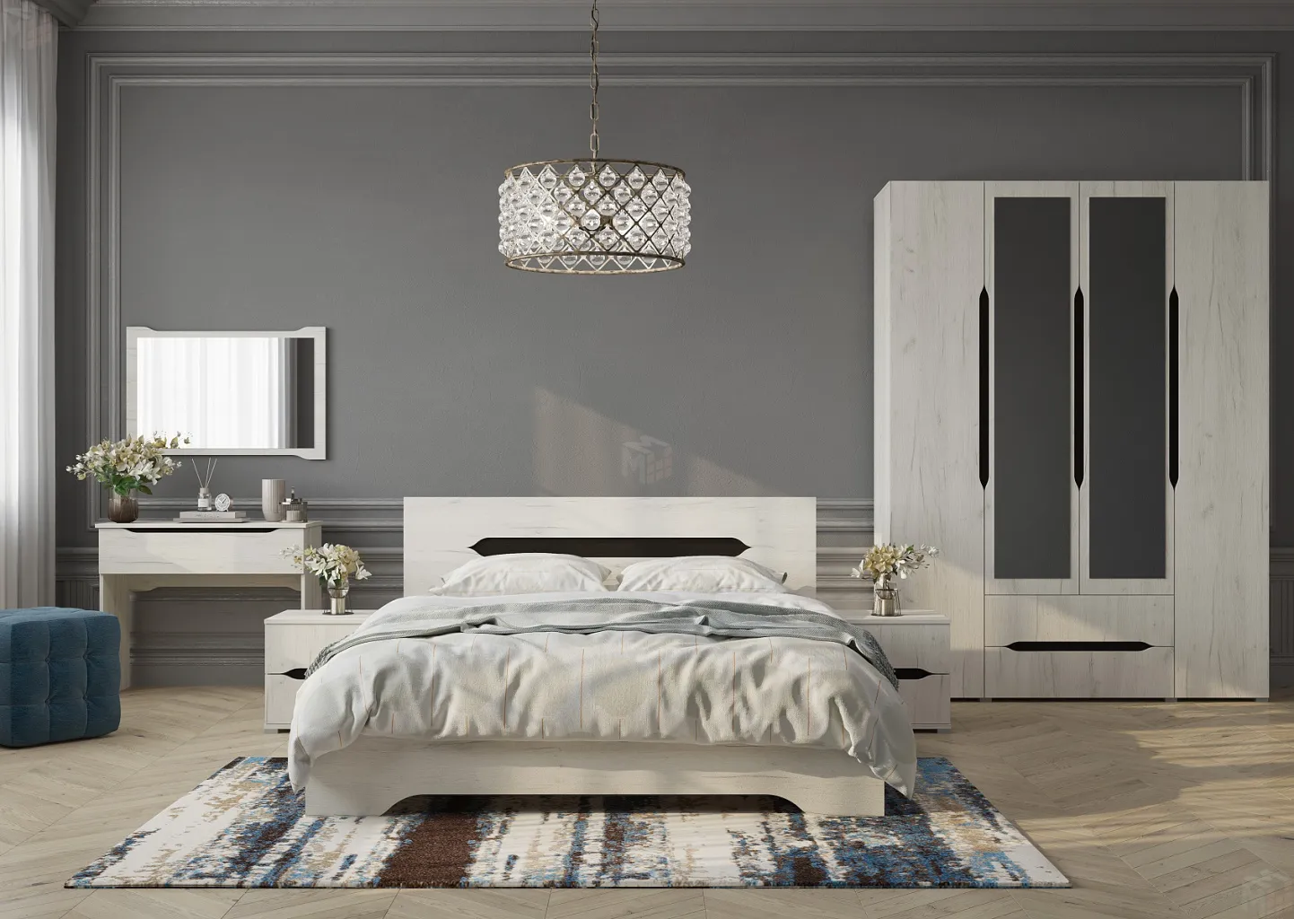 Кровать выполнена из ЛДСП. В стоимость входит основание под матрас - решетка с деревянными ламелями.