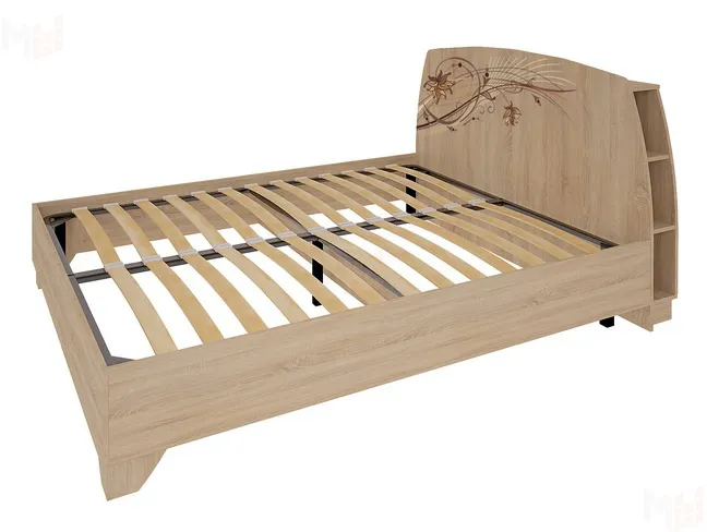 Кровать выполнена в цвете дуб Сонома и имеет ортопедическое основание, что способствует здоровому сну. Книжки, телефон и другие мелочи легко поместятся на полках за спинкой кровати и заменят вам прикроватные тумбы. Спинка кровати украшена современным принтерным рисунком.