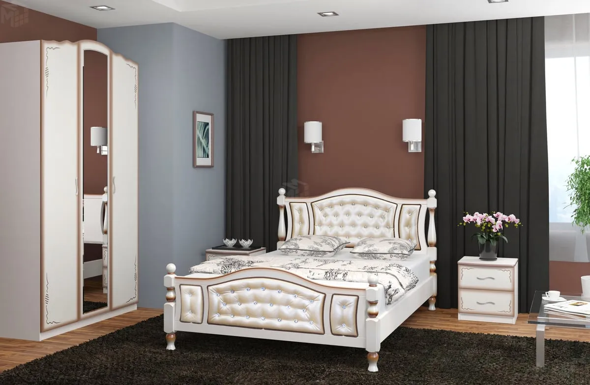 Кровать из массива и МДФ. Спинка кровати декорирована кожзамом темного цвета.