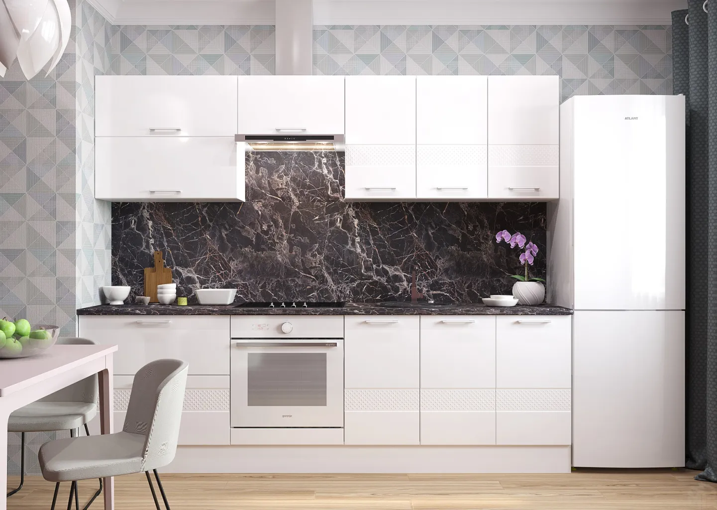Корпус кухни выполнен из ЛДСП белого цвета, фасады МДФ белый глянец (на фото). Цвет фасадов можно выбрать из предложенных.