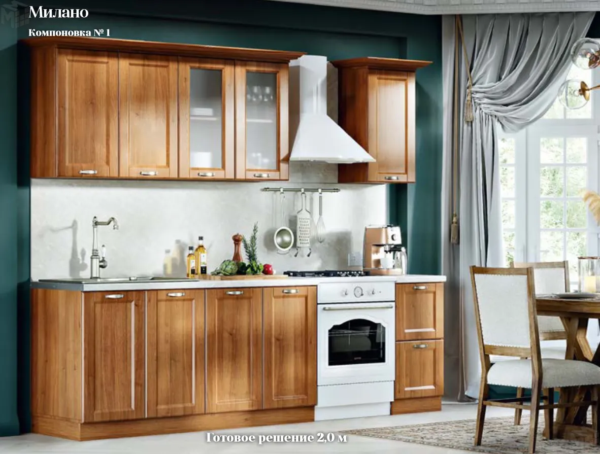 Стеновая панель, вытяжка, сушилка, мойка приобретаются дополнительно.