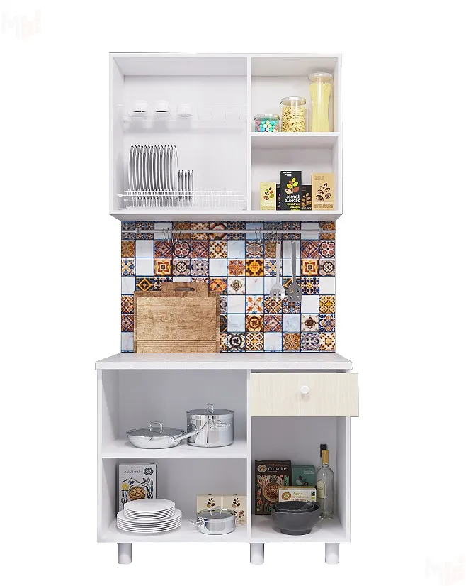 Кухонный гарнитур состоит из стола шириной 1000 мм, он поделен на 2 части - шириной 60 см с дверкой и шириной 40 см с ящиком и дверью. В гарнитур также входит верхний шкаф общей шириной 1000 мм, разделен на два отделения 60 и 40 см.