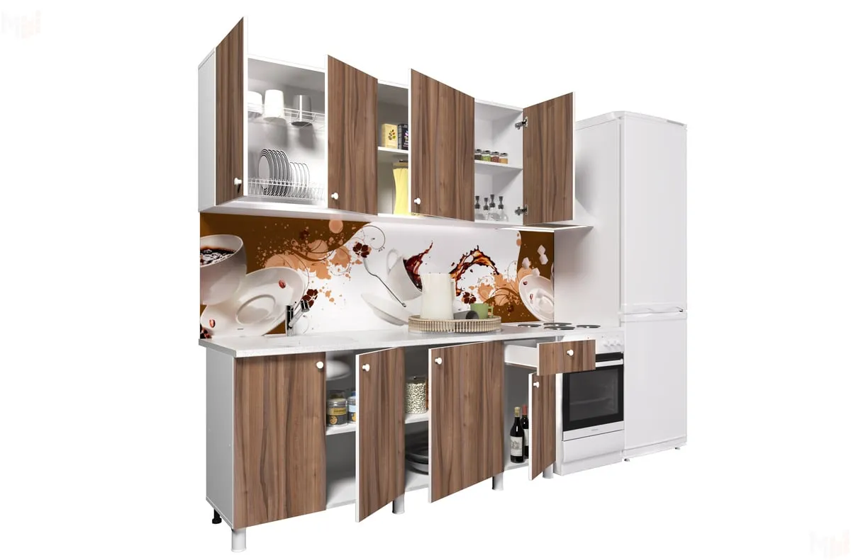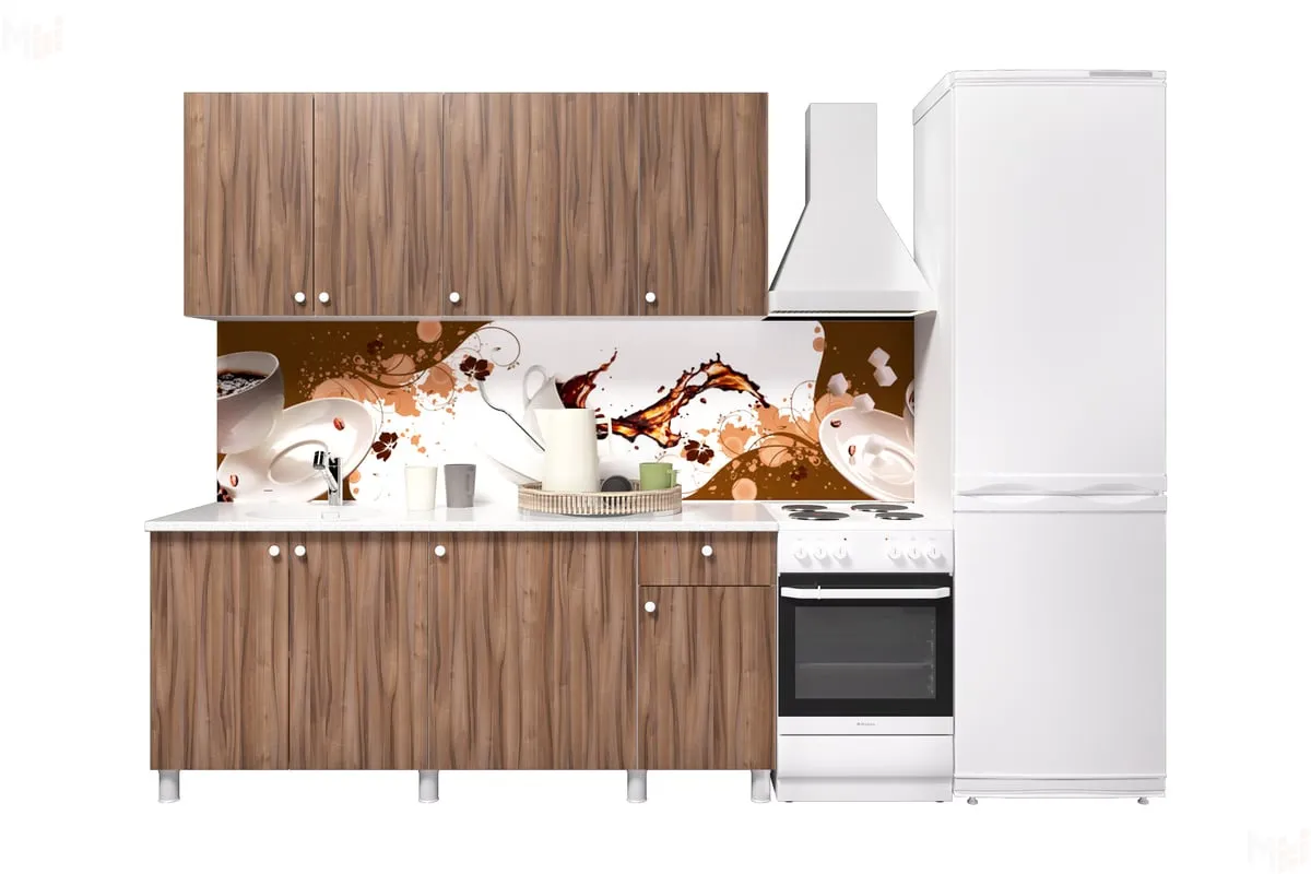 Кухонный гарнитур состоит из стола шириной 1800 мм, он поделен на 3 части - шириной 80 см с двумя дверками, стол 60 и стол 40см с ящиком и дверью. В гарнитур также входит верхний шкаф общей шириной 1800 мм, разделен на три отделения 80, 60 и 40 см.