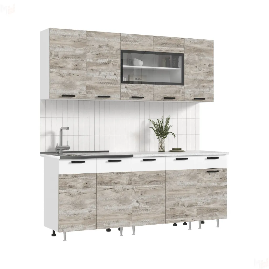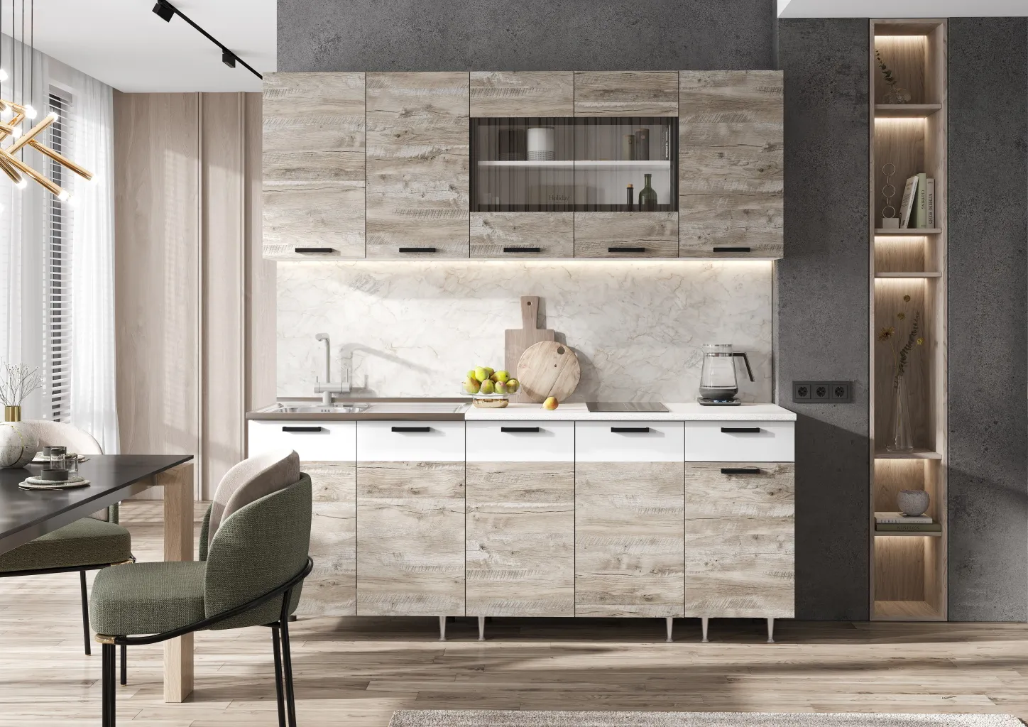 Каркас кухни выполнен из ЛДСП белого цвета. Фасады ЛДСП дуб юкон/вставка ЛДСП Белый.