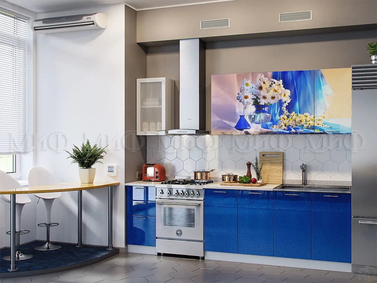 Кухонный гарнитур Ромашки имеет длину 2 метра. Корпус кухни выполнен из ЛДСП белого цвета, фасады белый шагрень/синий металлик с фотопечатью.