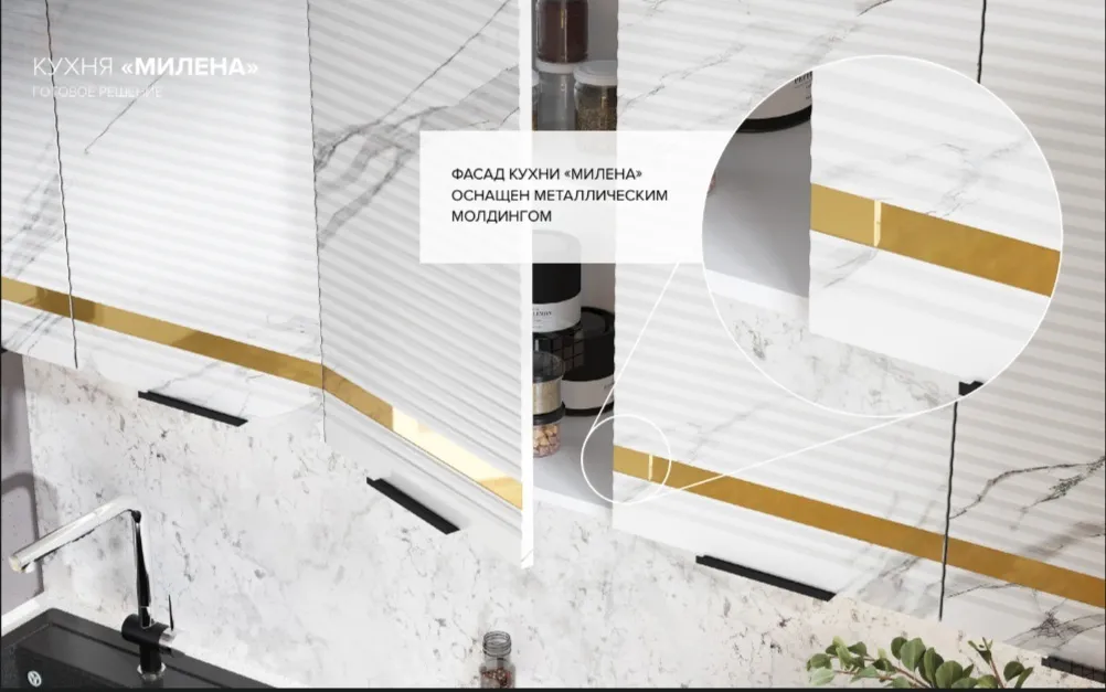 Фасад МДФ с пленкой ПВХ, цвет мрамор белый софт, вставка металлический молдинг.