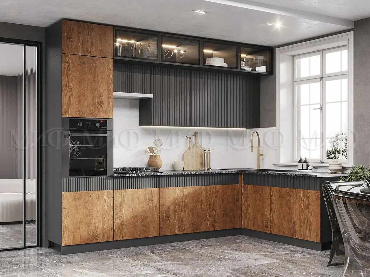 Корпус гарнитура выполнен из ЛДСП Графит 16 мм. Фасады МДФ Экзотическое дерево Амазония/Графит софт с 3Д фрезеровкой.