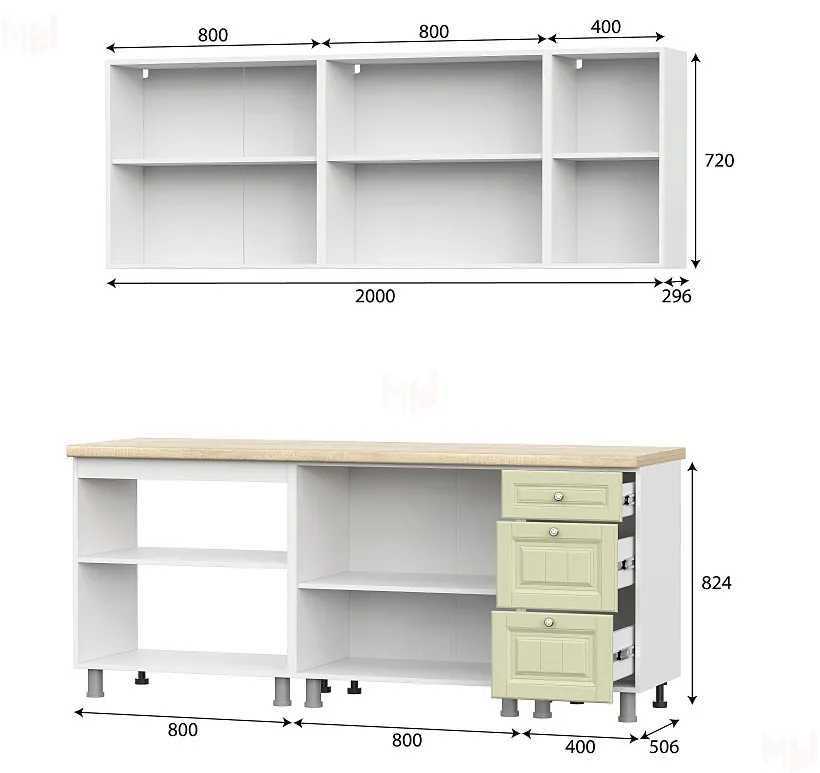 Столешница, стеновая панель, а также дополнительное оборудование (мойка, смеситель, бытовая техника) приобретаются отдельно.
