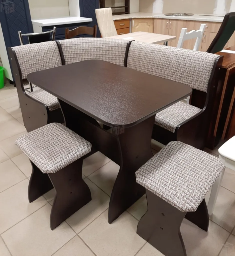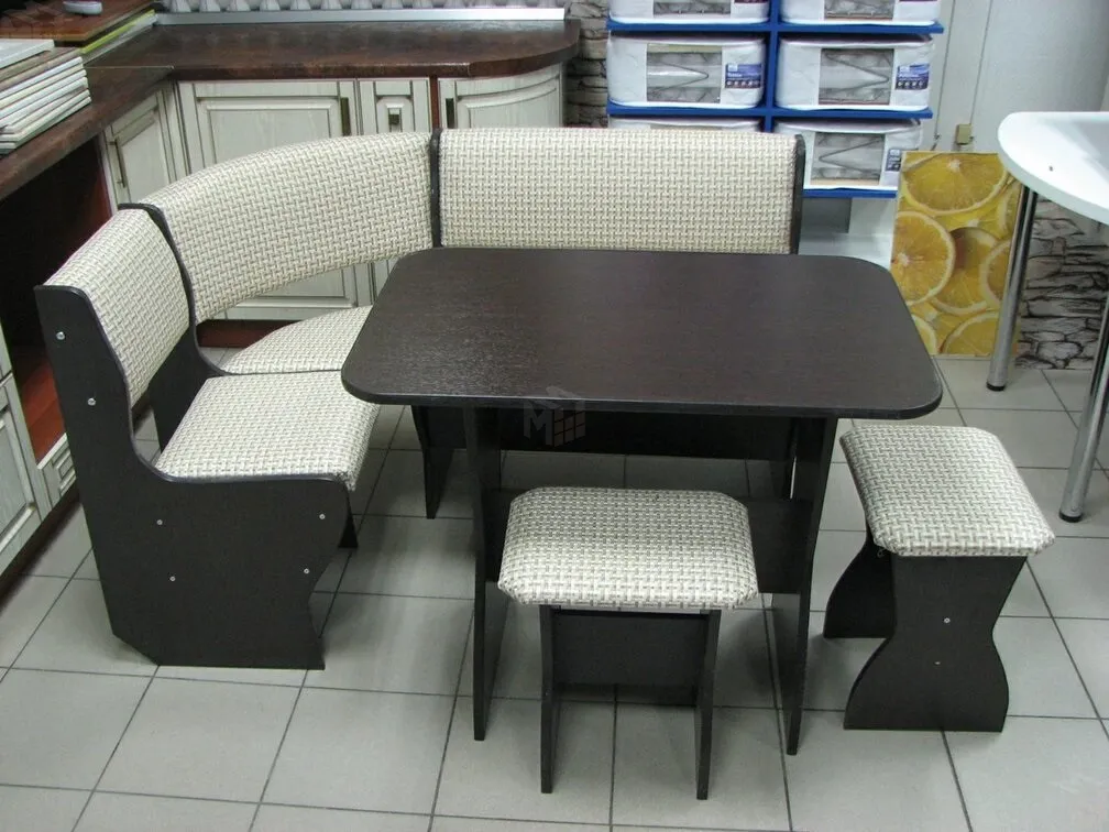 Кухонный уголок Аленка 5 выполнен из ЛДСП, имеет вместительные ящики для хранения мелочей под сидениями. Корпус- венге/ обивка рогожка темный серый.