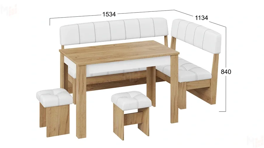 В состав входят: стол, угловая скамья и два табурета. Расстояние между опорами по длине стола - 820 мм, по ширине - 420 мм.