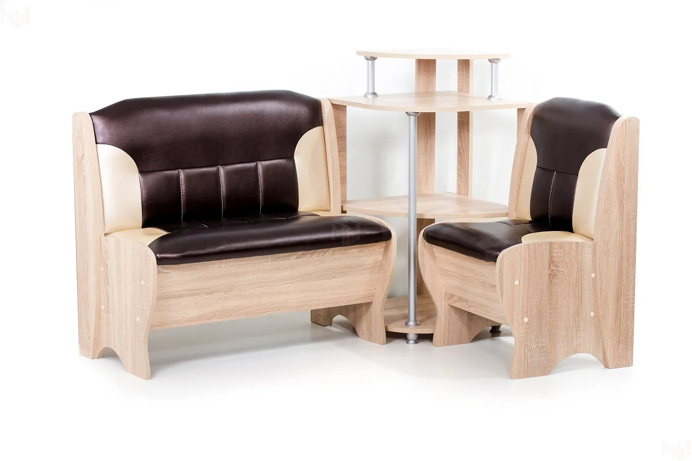 Угловая скамья Лотос имеет 2 ящика под сидениями для хранения мелочей. Каркас выполнен из ЛДСП дуб сонома, обивка выполнена из кожзама Терра эффект 221/101. -