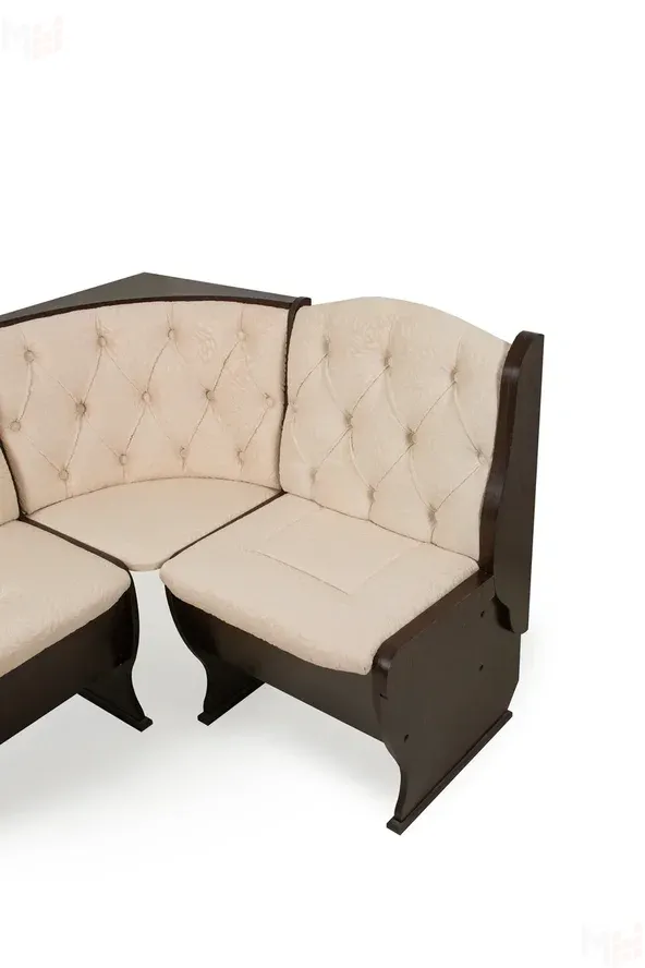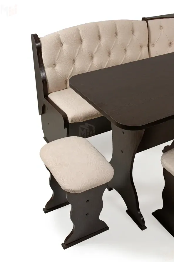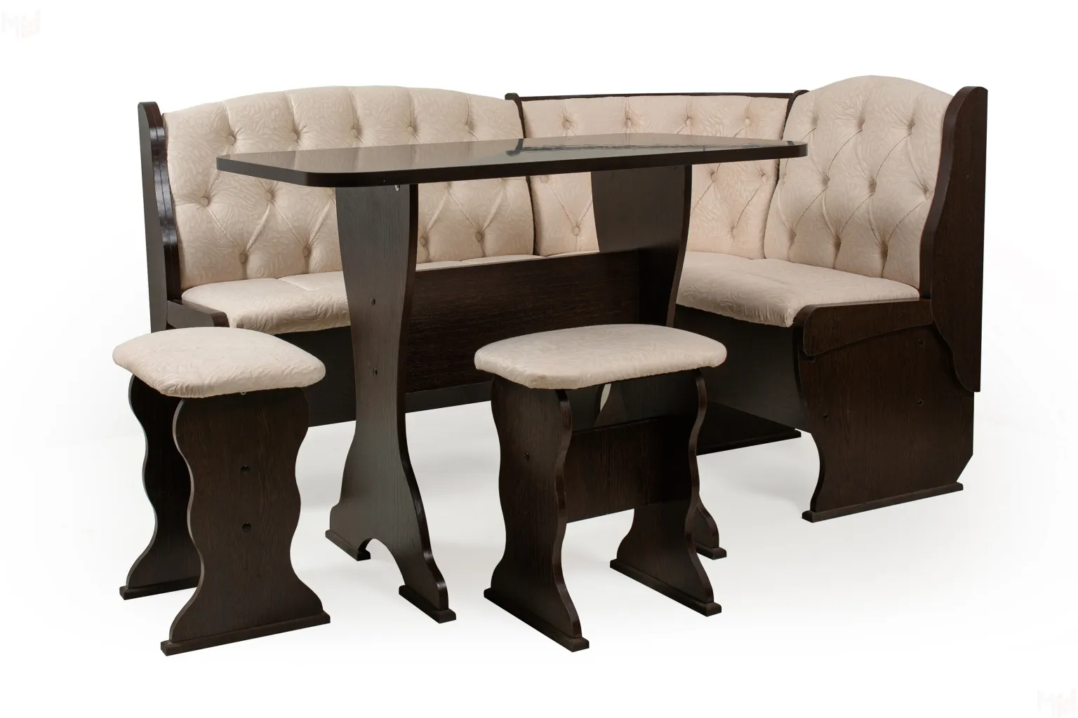 Кухонный уголок с двумя ящиками для хранения. Каркас из ЛДСП венге, обивка флок карамель. Покрытие столешницы термостойкий пластик. Современная и функциональная модель.