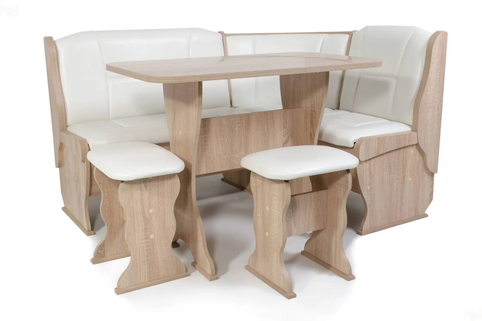 Кухонный уголок с двумя ящиками для хранения. Каркас из ЛДСП Сонома, обивка кожзам Милк. Покрытие столешницы термостойкий пластик. Современная и функциональная модель.