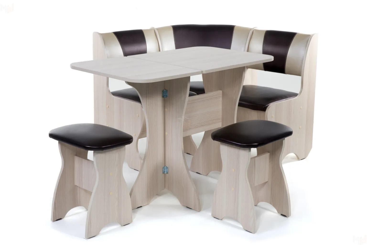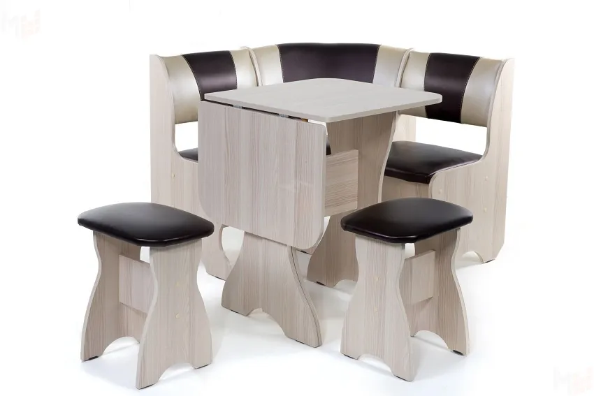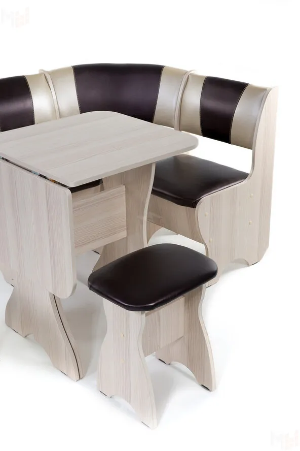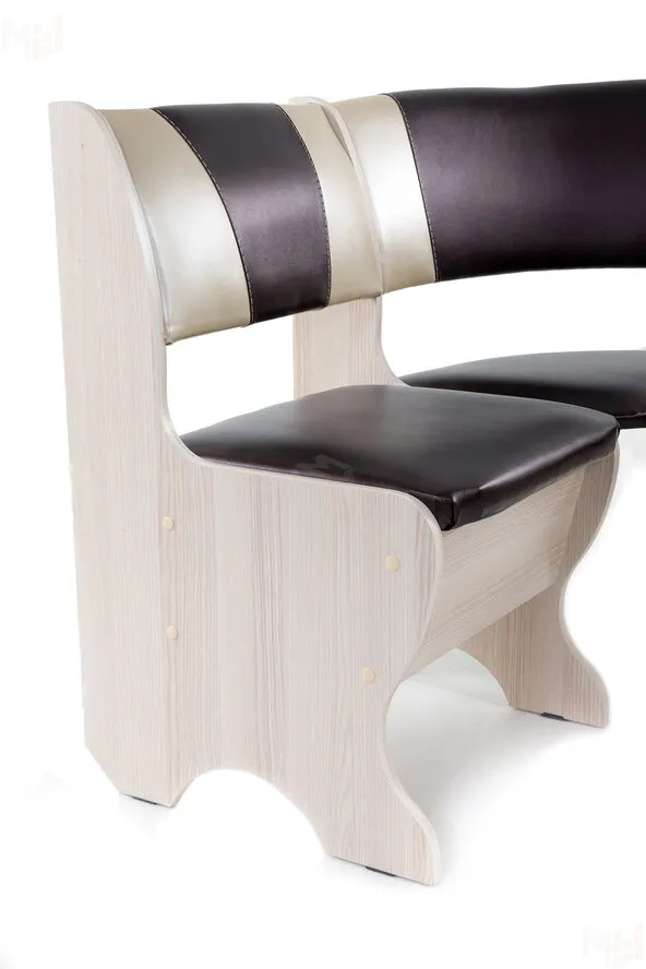 Кухонный уголок небольшого размера (100*100 см) с двумя ящиками под сидениями. Корпус выполнен из ЛДСП ясень, обивка кожзам Барнео умбер. Глубина уголка от стены 500 мм.