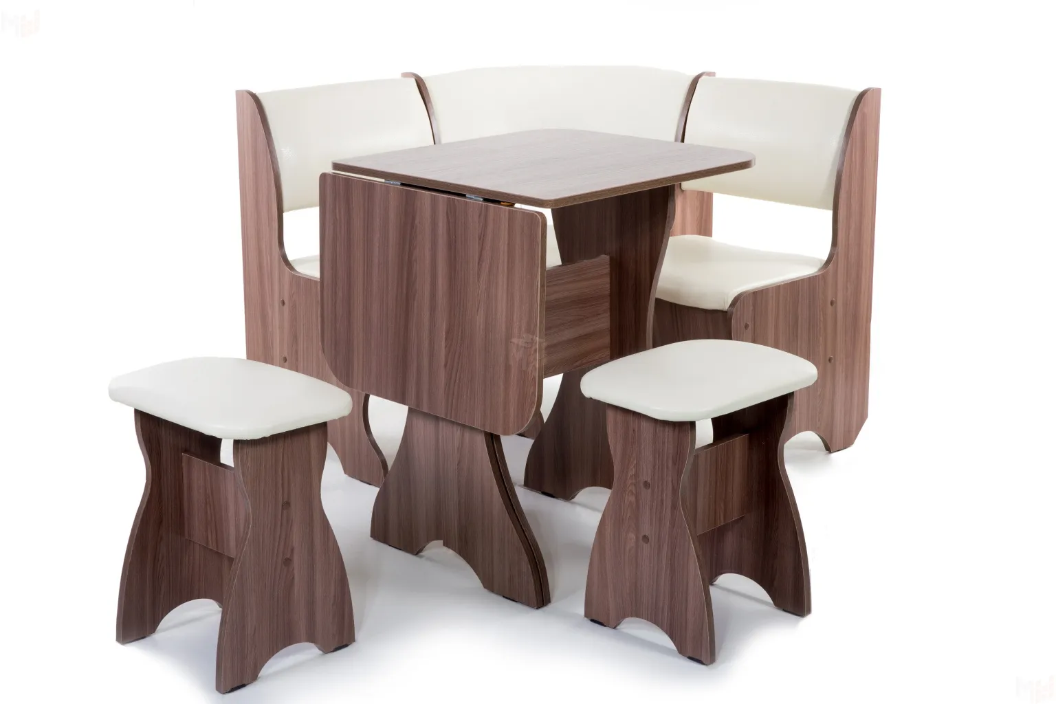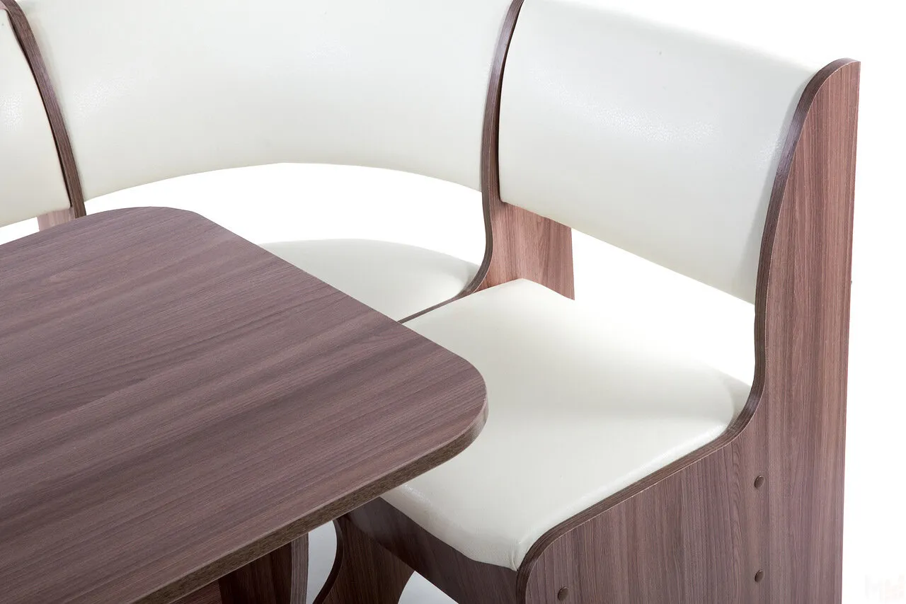 Кухонный уголок небольшого размера (100*100 см) с двумя ящиками под сидениями. Корпус выполнен из ЛДСП ясень шимо темный, обивка кожзам Барнео крем. Глубина уголка от стены 500 мм.