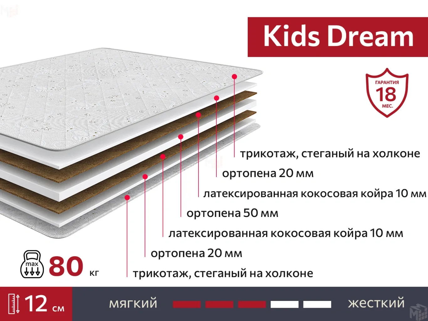 В матрасе Kids Dream идеальное сочетание наполнителей – латексированной кокосовой плиты и ортопены.