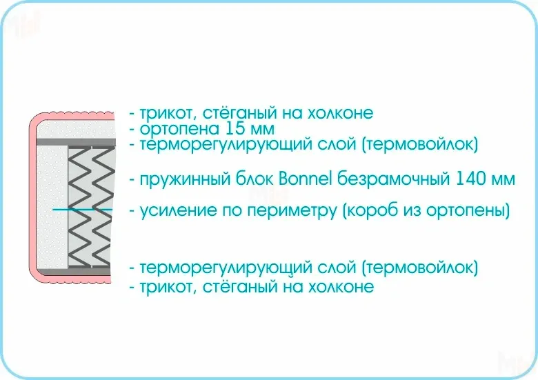 Слой ортопены надежно защищен от истирания слоем термовойлока, находящемся между ним и пружинным блоком, тем самым значительно продлевается срок службы матраса.