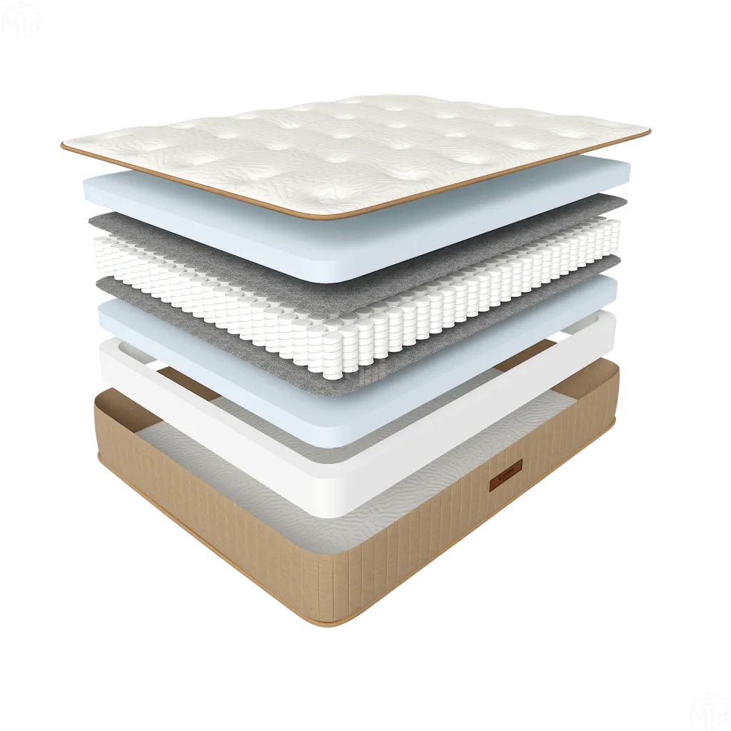 Пружины надежно изолированы от мягких наполнителей слоем прочного термовойлока, что исключает ощущение наличия пружин во время сна. Мягкий настил состоит из пышного слоя искусственного латекса. Искусственный латекс — является одним из видов пенополиуретана, по своим свойствам приближенный к натуральному латексу. Он отлично вентилируется, не впитывает неприятные запахи и влагу.