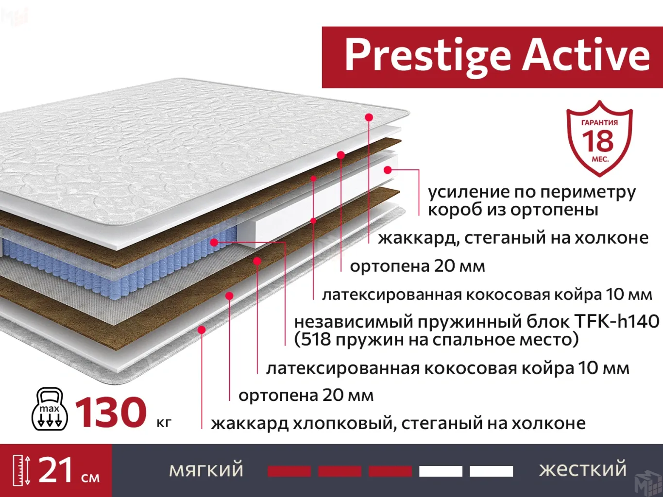 Анатомический матрас Prestige Active обладает повышенным запасом прочности. Блок независимых пружин с увеличенной надежностью чутко реагирует на каждое изменение положения тела, тут же принимая оптимальную форму и распределяя нагрузку.