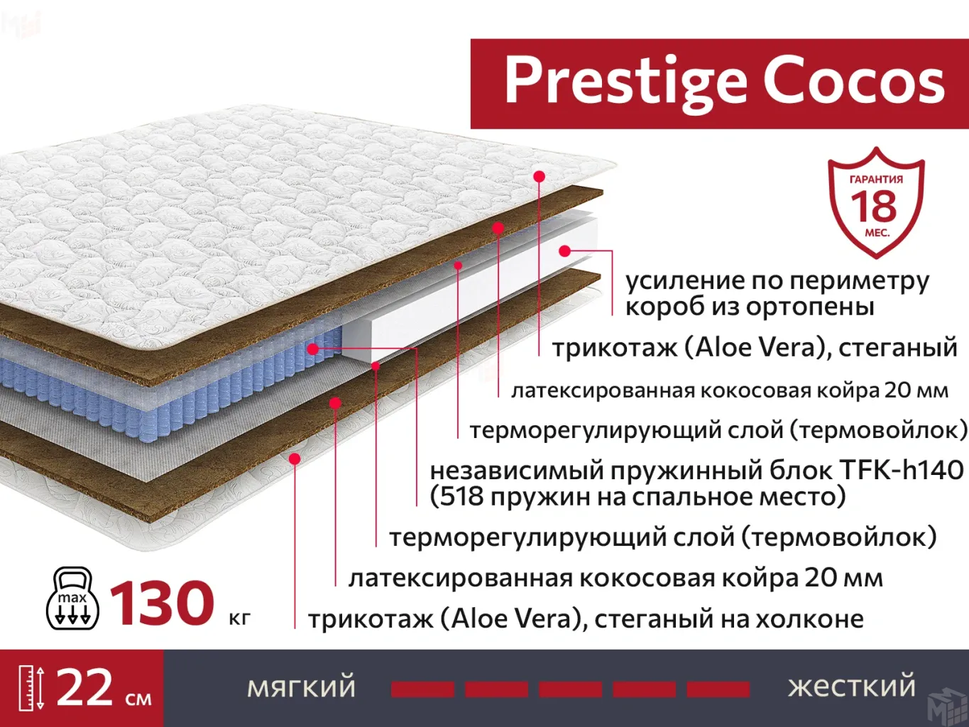 Двусторонний анатомический матрас Prestige Cocos – выше средней жесткости – для всех, кто следит за здоровьем спины. Создан для ценителей упругого спального места и всех, кто заботится о красоте осанки.