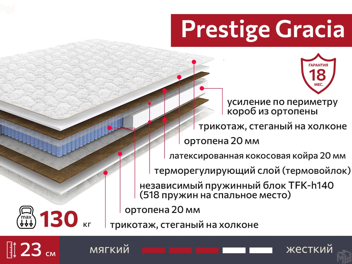 Сочетание кокоса с независимыми пружинами, как в матрасе Prestige Gracia, – излюбленный выбор многих покупателей. Упругий кокос качественно распределяет давление, независимый пружинный блок гибко поддерживает каждый сантиметр тела. Трикотажная ткань, простеганная на высокообъемном наполнителе, придает пышность и легкость спальному месту.