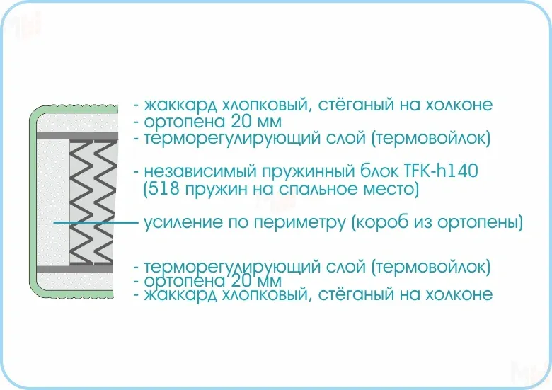 Прочный терморегулирующий слой устойчив к истиранию, что существенно продлевает срок службы изделия. Слой упругой ортопены улучшает анатомические свойства матраса, повторяя контуры тела спящего. Вы прекрасно выспитесь и утром будете чувствовать себя отлично! -