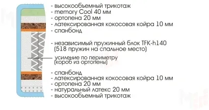 Наполнитель: ортопена, блок независимых пружин, латекс, охлаждающий Memory, кокосовая койра
