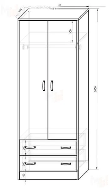- широкий шкаф с двумя выдвижными ящиками внизу моноблока и гардеробным отделом с полкой и металлической штангой;