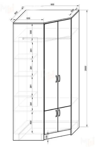 - угловой двухдверный шкаф - моноблок с продуманной системой хранения для одежды;