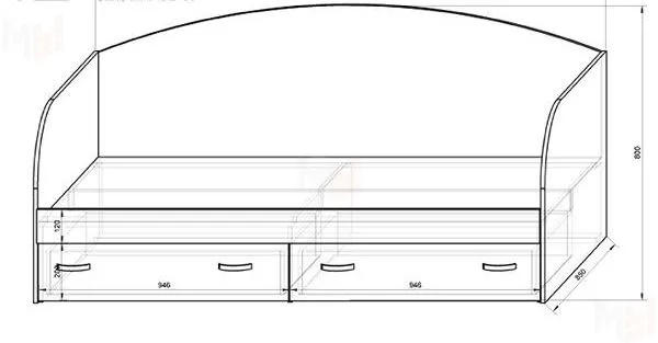 - низкая кровать КП-13/7 со спальным местом 1900х800 мм. Основание - лист ДСП. Наполнение - два ящика на роликовых направляющих. Форма - по типу диванчика со спинкой и высокими боковинами;