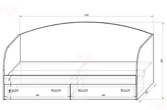 - кровать со спальным местом 1900х800 мм. В конструкции предусмотрено два выдвижных ящика и лист ДВП в основании.